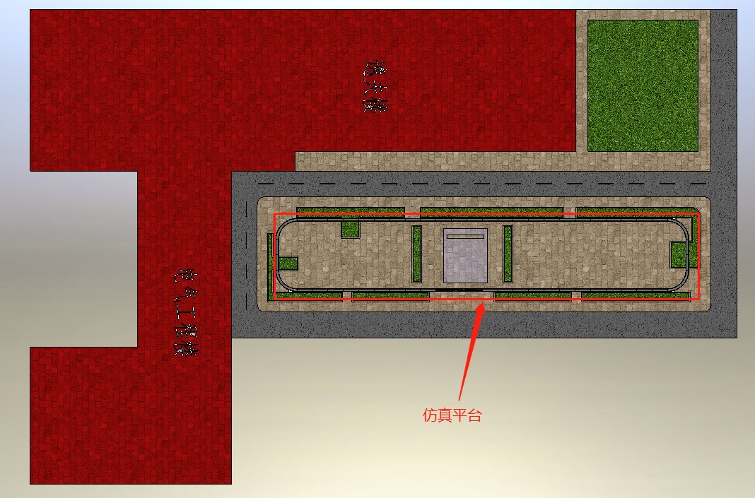 仿真平台设定在电气楼以东,逸夫楼以南的花园空地上,长度约80米(80251.73mm),宽度14米(14251.73mm),最小转弯半径:3500mm,周长约186米。如图1所示。